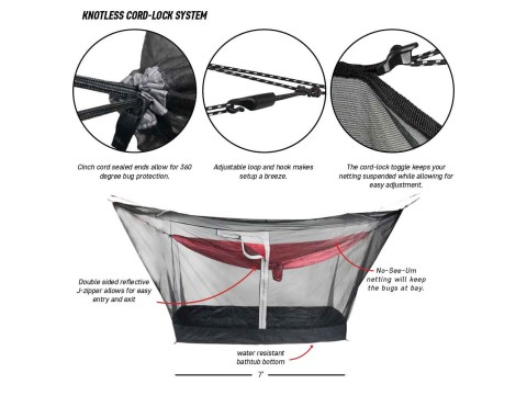 거의 대부분의 해먹에 맞는 고급 모기장, 빌트인 도어, 방수 욕조 바닥까지 갖추고 있어 지상의 장비를 완벽하게 보호할 수 있습니다.
