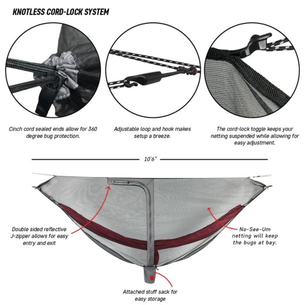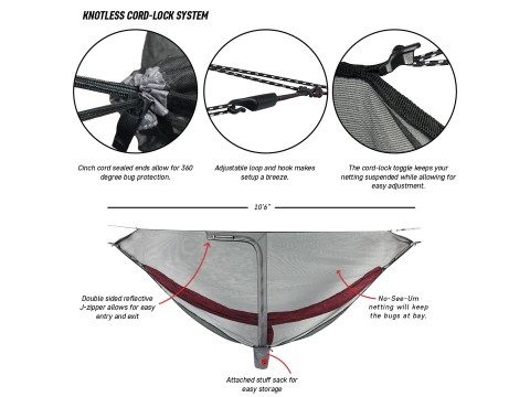 프리미엄 20D 모노 메쉬 그물망은 통풍을 위한 통기성 소재로 설계되어 캠프에서 편안하게 지낼 수 있도록 벌레로부터 당신을 숨깁니다. 통합 능선을 통해 Mozzy Net Lite를 모든 비파리 또는 방수포와 함께 사용할 수 있습니다. 또한 Grand Trunk의 매듭 없는 코드 시스템으로 설치가 간편하고 한밤중에도 쉽게 출입할 수 있도록 마커로 강조된 J 지퍼가 있습니다.