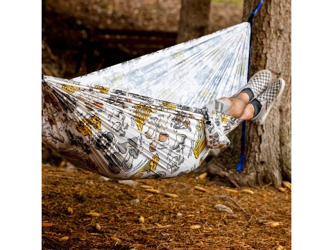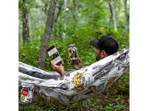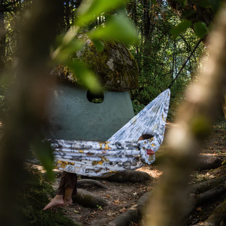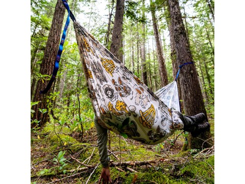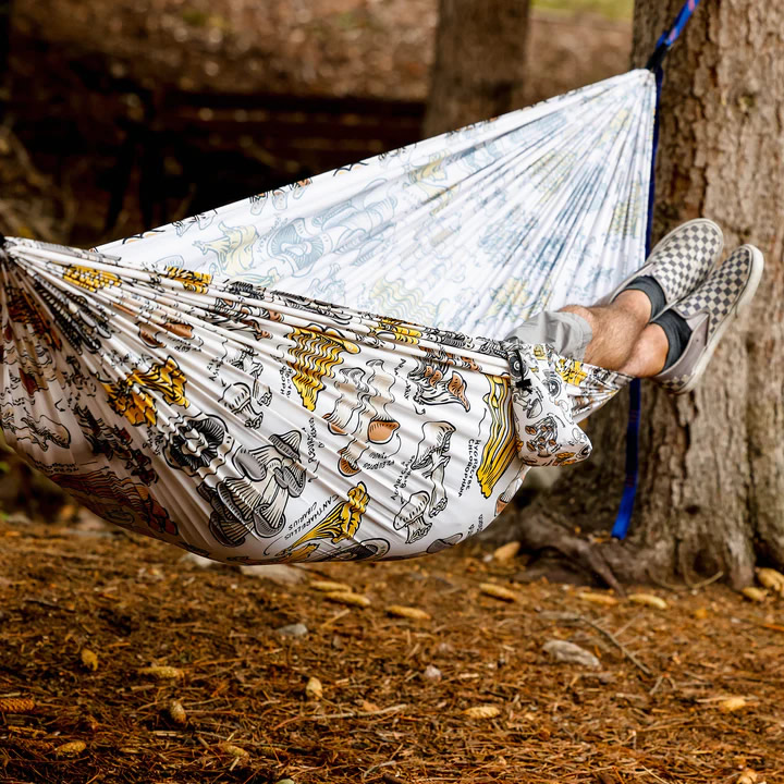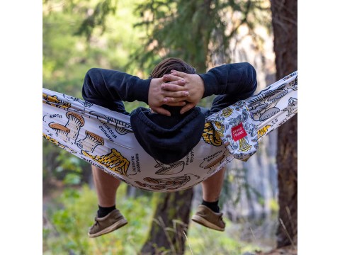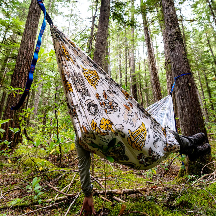 공터 가장자리에 있는 두 그루의 나무는 잘 얻은 휴식. Fungi Field Guide 해먹에 들어가 발을 쓸어 내리십시오.