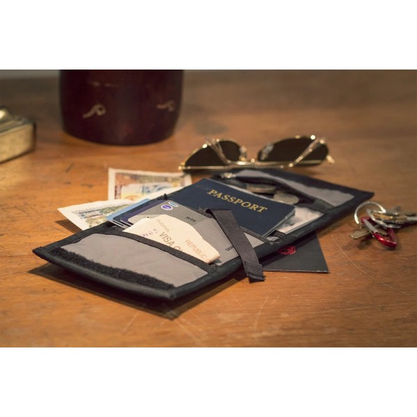 내구성이 뛰어난 나일론 수납칸에 여권, 카드, 현금을 정리할 수 있습니다.